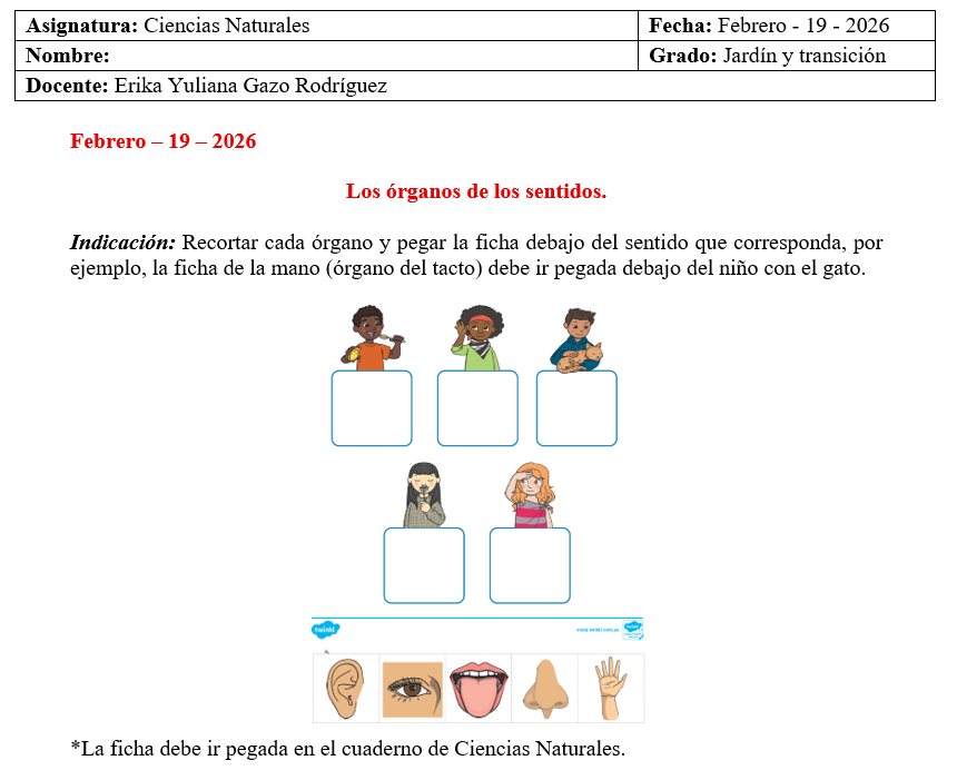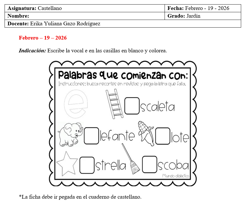 Teniendo en cuenta que no podremos asistir al colegio el día 19 de febrero (jueves) por motivos de fuerza mayor, les comparto las fichas/tareas para que con sus papitos las realicen muy juiciosos en casa. Con ayuda de Dios, nos veremos nuevamente el viernes 20 de febrero. Un abrazo.